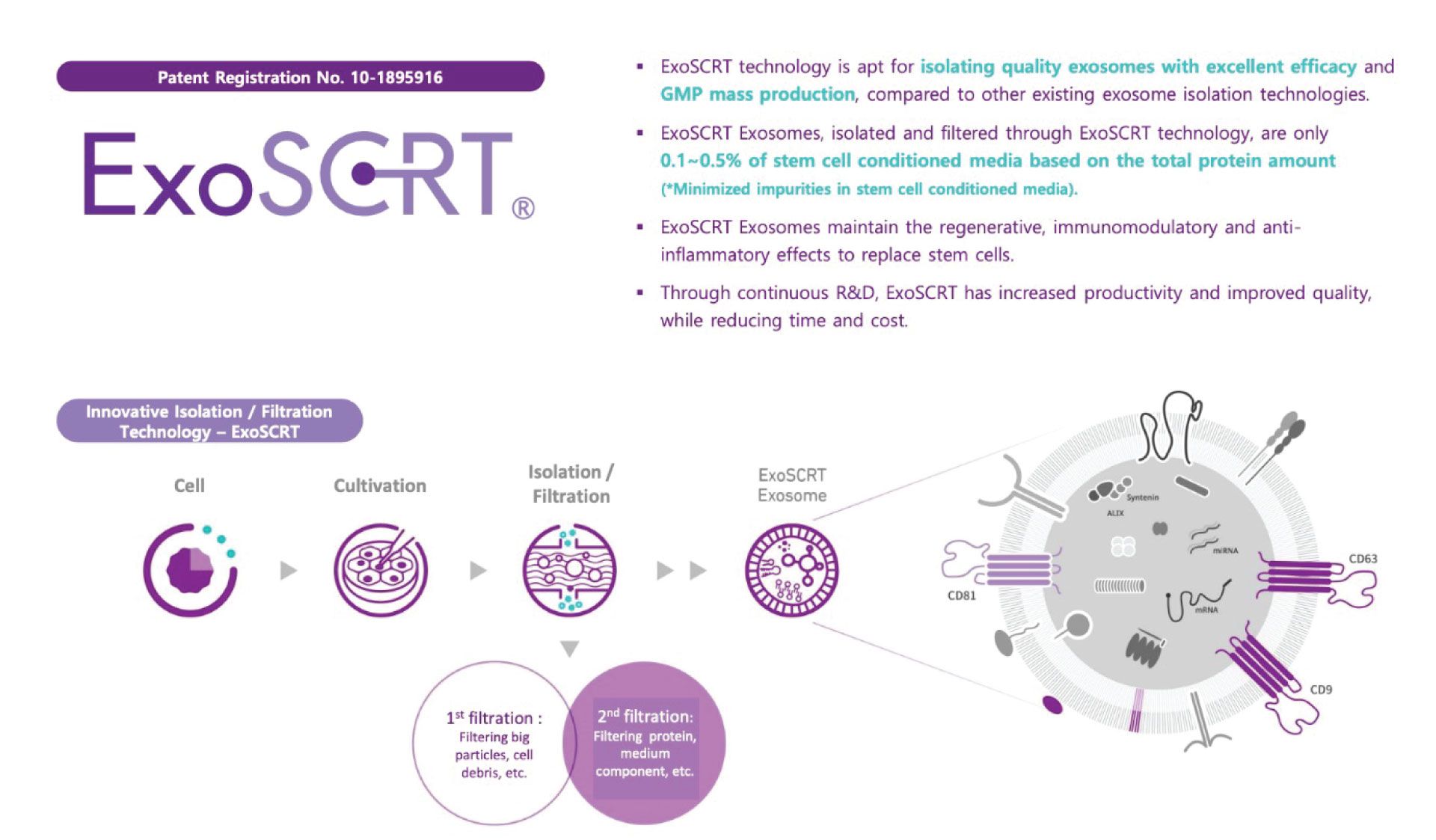 - ExoCoBio’s exosomes contains PRDXs, a protein proven to have anti-aging and skin regeneration effects, and let-7b, one of miRNA proven to have anti-inflammatory efficacy by clinical trials and theses. In addition, one of exosomes marker CD44 enables to deliver active ingredients into the skin. These factors are proved by scientific research.